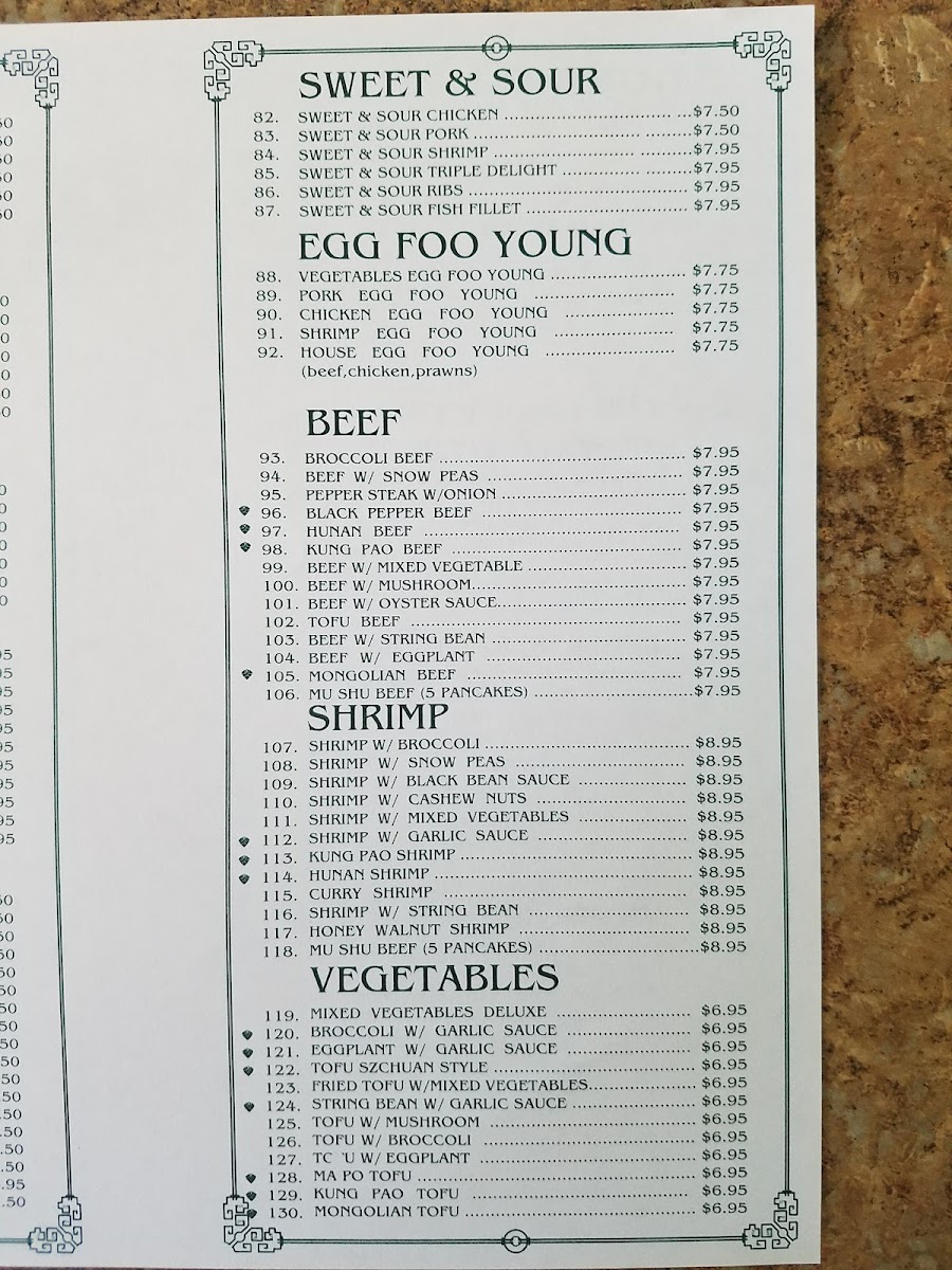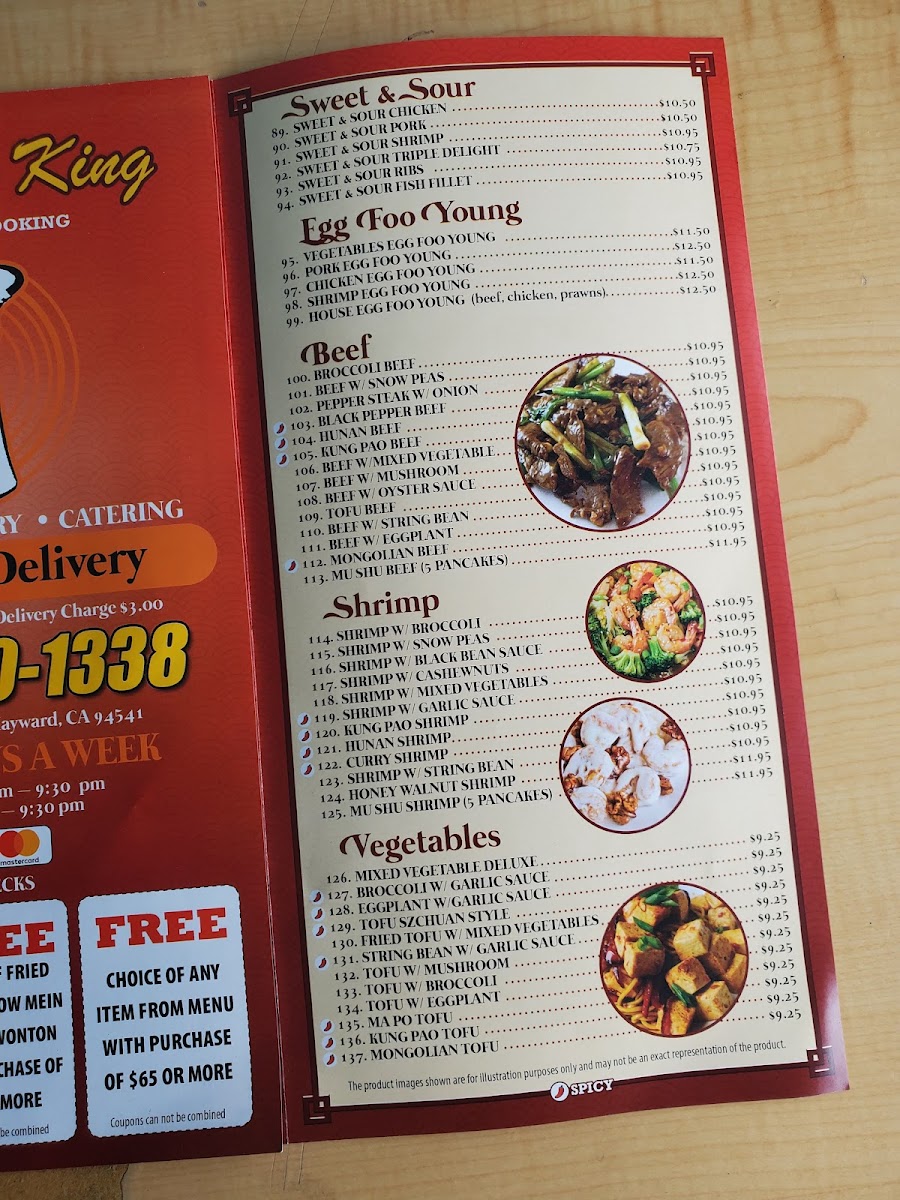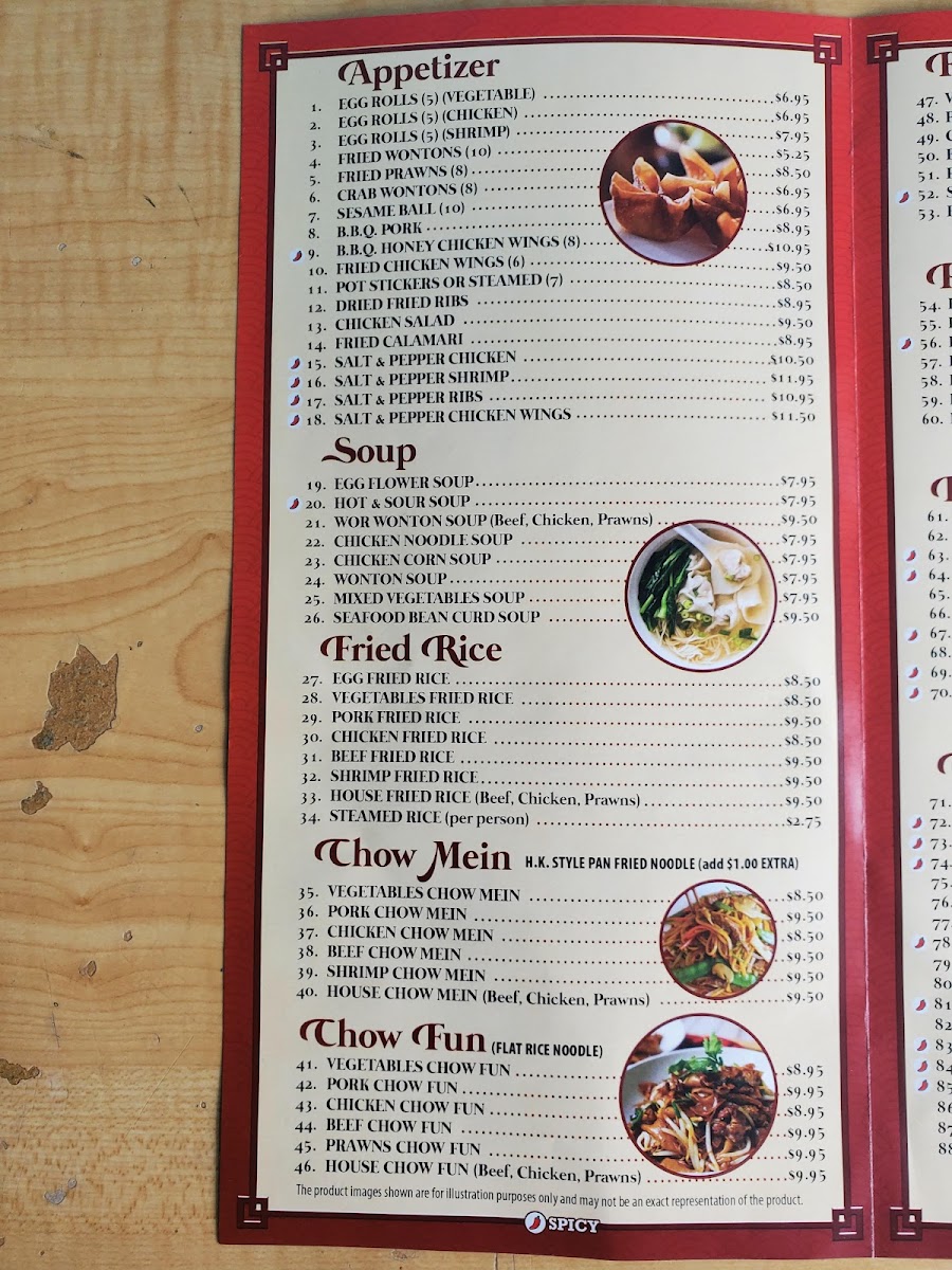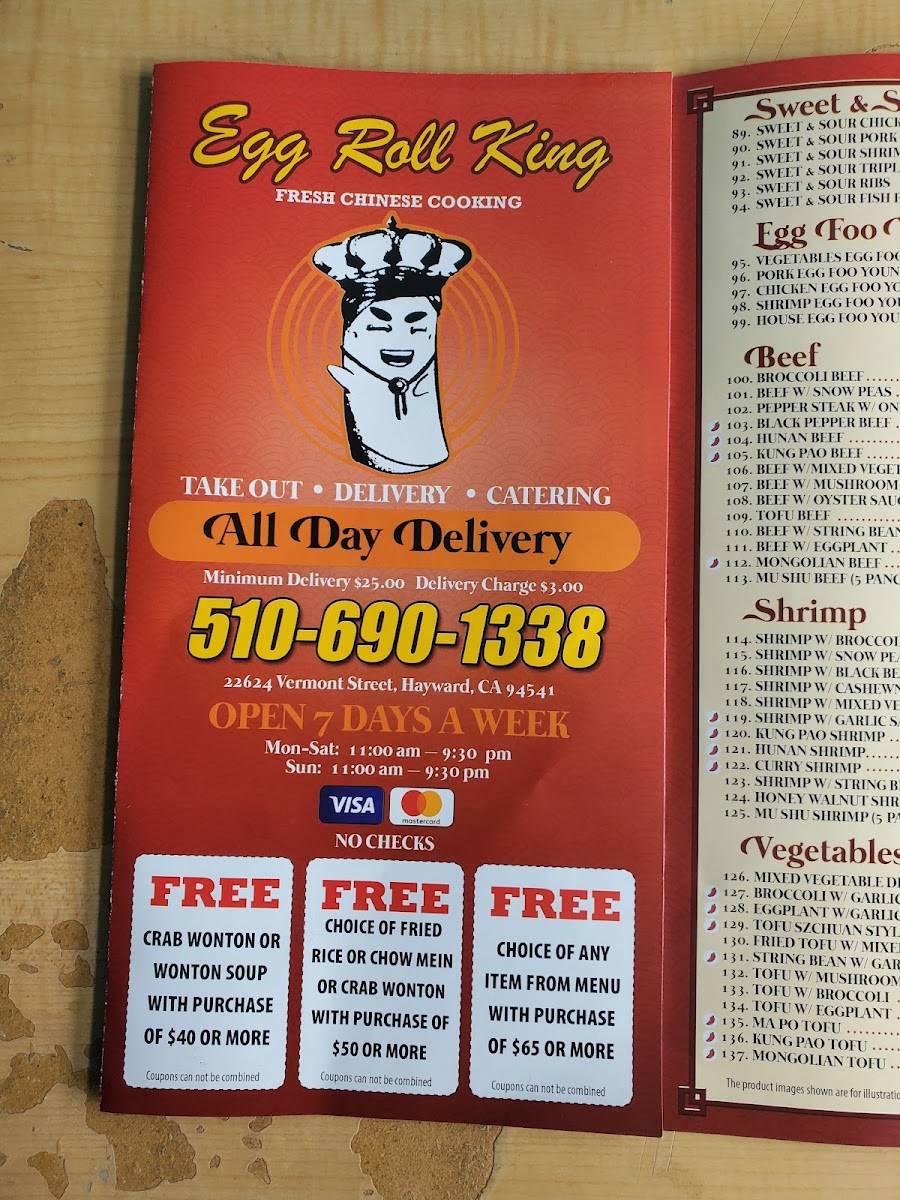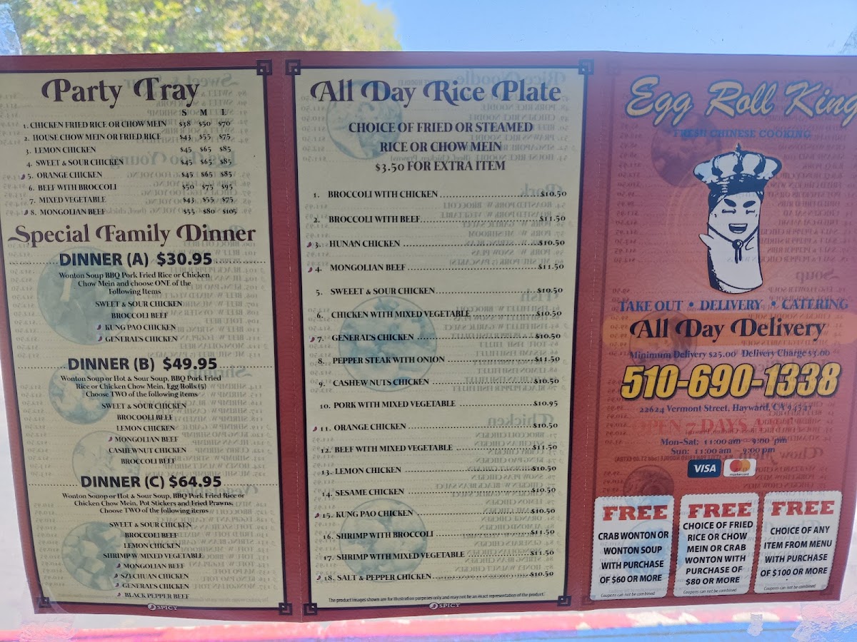 The menu at Egg Roll King offers a broad range of classic Chinese dishes, providing something for every palate. The appetizer section features a variety of egg rolls, including Egg Rolls (5) (Vegetable), Egg Rolls (5) (Chicken), and Egg Rolls (5) (Shrimp), all priced similarly, along with options like Fried Wontons (10) and Fried Prawns (8). For soup lovers, there are comforting choices such as Egg Flower Soup, Hot And Sour Soup, and Wor Wonton Soup. The fried rice options are extensive, including Egg Fried Rice, Vegetable Fried Rice, and Chicken Fried Rice, among others. The chow mein and chow fun sections offer a variety of options, such as Pork Chow Mein, Beef Chow Fun, and Shrimp Chow Fun. There are also several rice noodle dishes, including Vegetable Rice Noodle and Prawns Rice Noodle. For those craving protein, Egg Roll King features a variety of meat and seafood dishes such as Roasted Pork W. Broccoli, Fish Fillet With Garlic Sauce, Szechuan Chicken, and Kung Pao Beef. The sweet and sour section stands out with its many options, like Sweet And Sour Chicken, Sweet And Sour Ribs, and Sweet And Sour Fish Fillet. The Egg Foo Young selections include Vegetable Egg Foo Young and House Egg Foo Young, offering hearty choices for all tastes. For beef and shrimp lovers, there are dishes like Beef With Broccoli, Pepper Steak With Onion, and Shrimp With Cashew Nuts. Vegetarians can enjoy a range of dishes such as Mixed Vegetables Deluxe and Fried Tofu With Mixed Vegetables. Additionally, the restaurant offers family-style dinners with options like Family Dinner A, Family Dinner B, and Family Dinner C, as well as party trays like the Chicken Fried Rice Party Tray and Lemon Chicken Party Tray. With a wide variety of dishes across multiple categories, Egg Roll King has something to satisfy every craving.