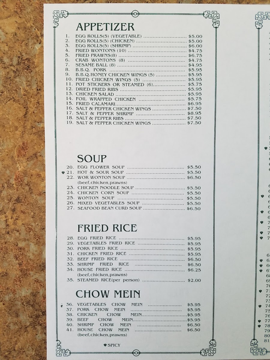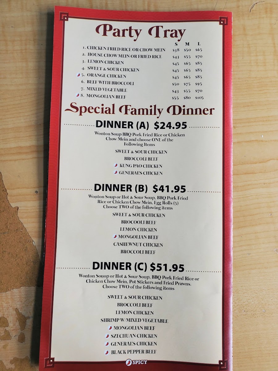 Served with your choice of wonton soup or hot sour soup, your choice of BBQ pork fried rice or chicken chow mein, 5 egg rolls, and your choice of 2 entrees.